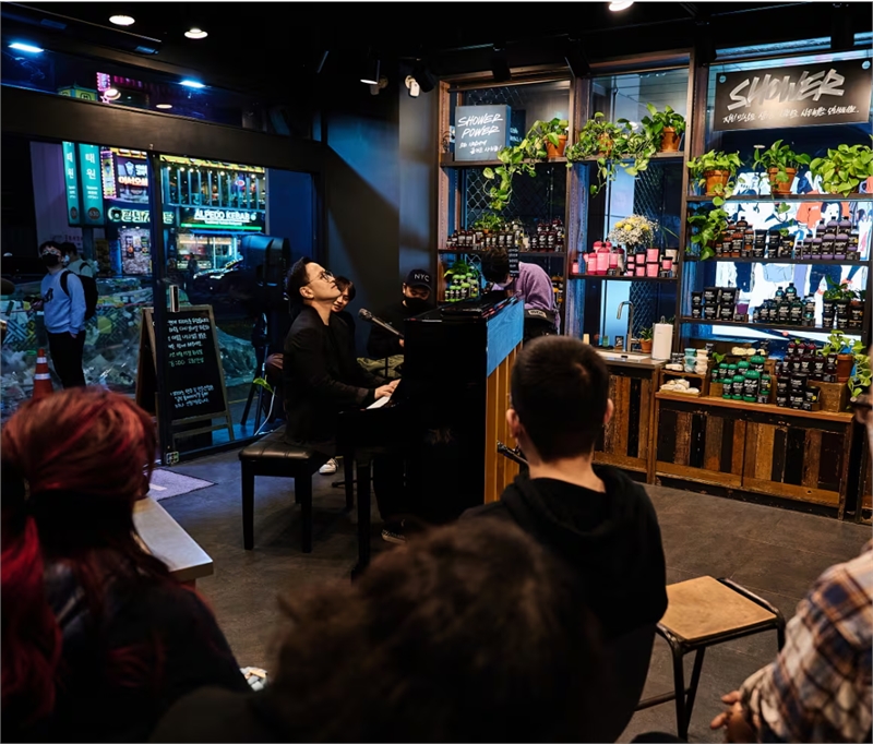 이태원 참사 이후 2주간 애도 기간을 가졌던 러쉬 이태원역점은 매장 재개장일인 지난 13일부터 20일까지 매장에서 작은 음악회를 진행했다. 사진은 지난 16일 저녁 공연을 펼치고 있는 고희안 피아니스트. /러쉬코리아