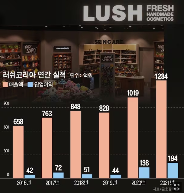 20년 전 다섯 명이 시작한 러쉬코리아는 현재 800명의 임직원과 70여 개의 매장을 가진 중견 기업이 됐다. 신종 코로나바이러스 감염증(코로나19) 여파에도 2021년 회계연도(2021년 7월~2022년 6월) 매출이 1234억원으로 전년 대비 21% 증가했고, 같은 기간 영업이익은 194억원으로 41% 늘었다.
