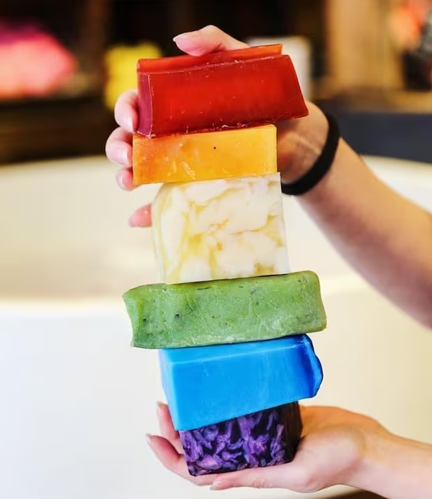 러쉬에서 판매하는 고체 비누들. 포장지 없이 진열해 두고, 고객이 원하는 양만큼 잘라서 판다. /러쉬코리아